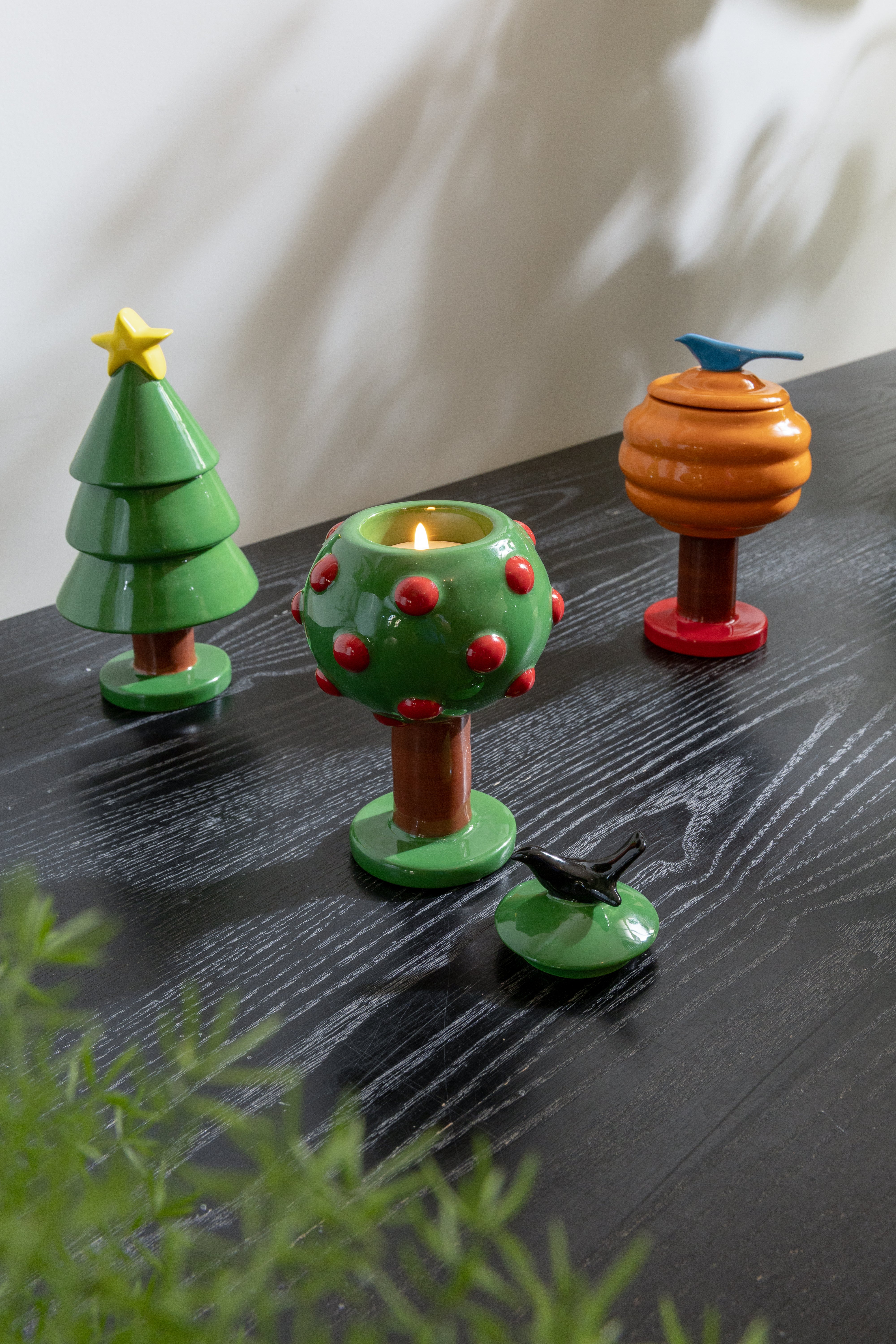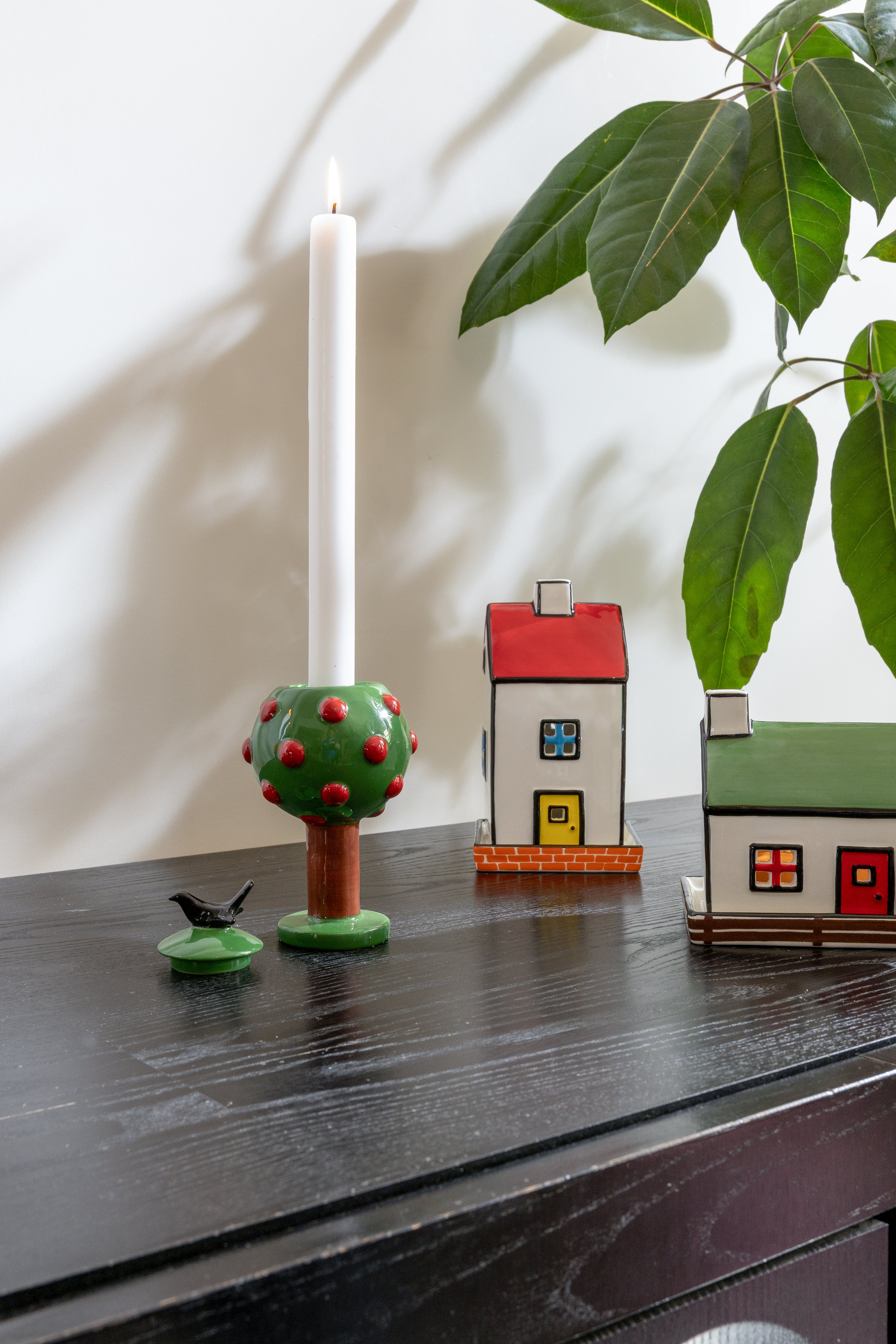 In collaboration with English ceramicist and illustrator Hal Haines, these tree-shaped candle holders bring a playful forest vibe to your home. Crafted from ceramic and hand-painted in vibrant colors, they showcase Haines’ distinctive blend of storytelling and design. Mix & match with Hal Haines’ tealight houses to create your own cheerful miniature village full of light and color. Designed to hold both dinner candles and tealights, they add charm to any setting, from festive tables to cozy corners. Carefully packed in &klevering’s special edition box featuring Haines’ artwork.