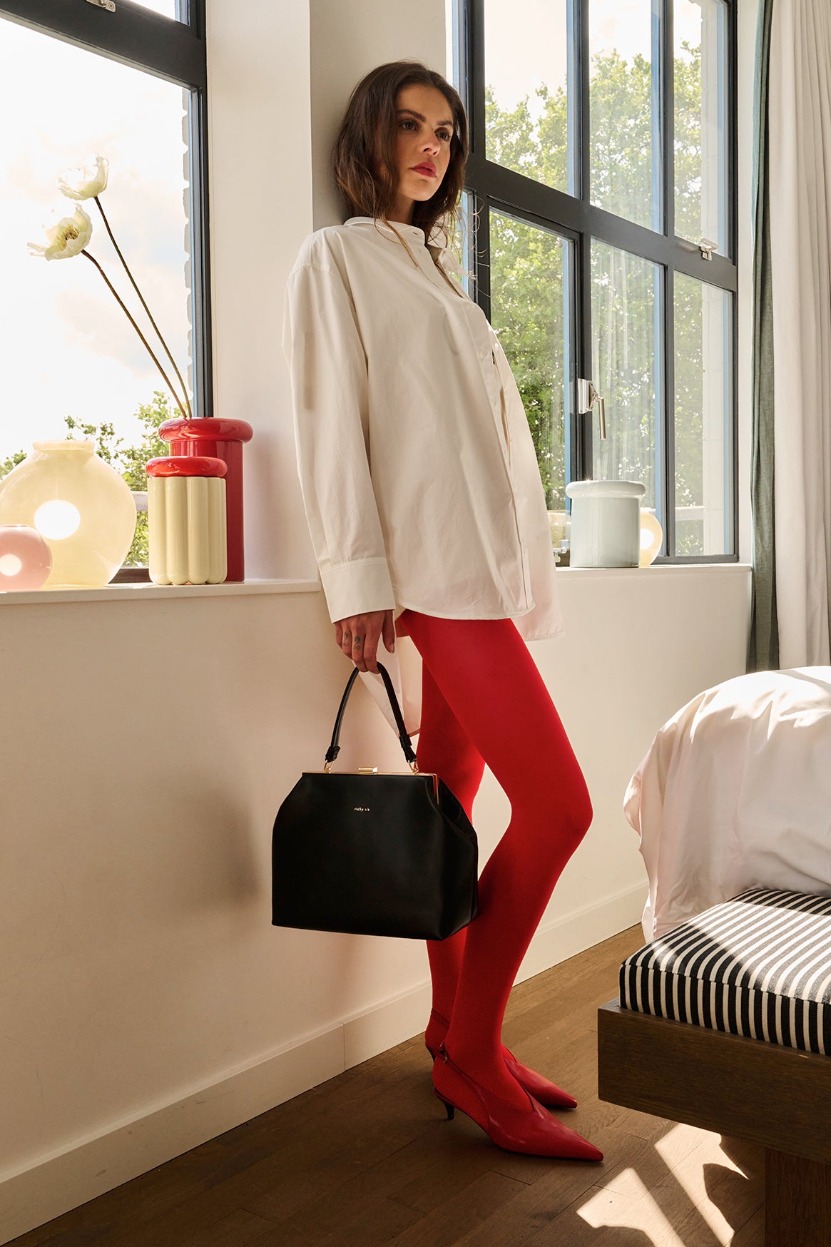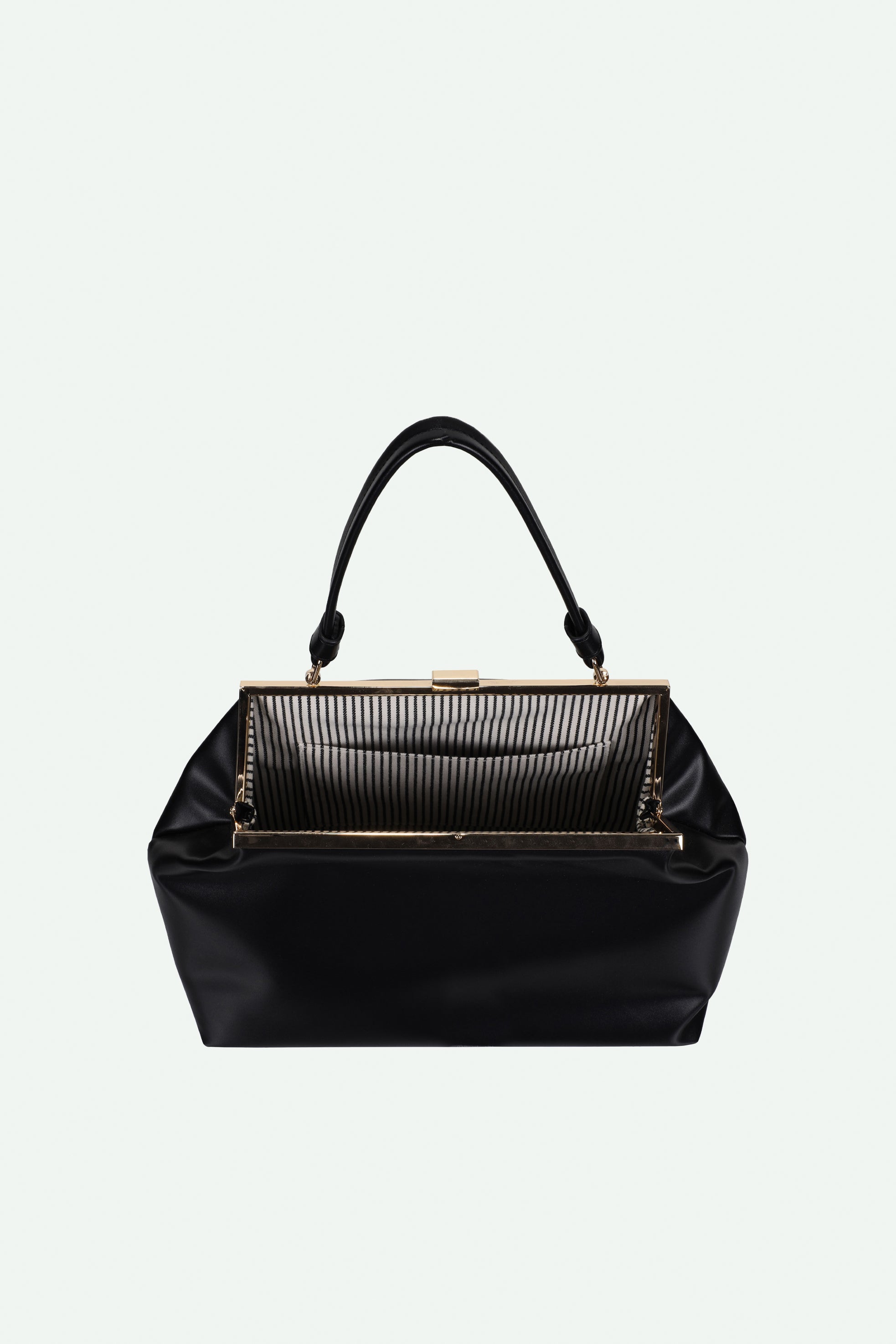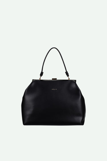 A classic clasp bag. Made from super soft vegan leather, it features gold metal details and an elegant short handle. Chic, effortless and elevated.