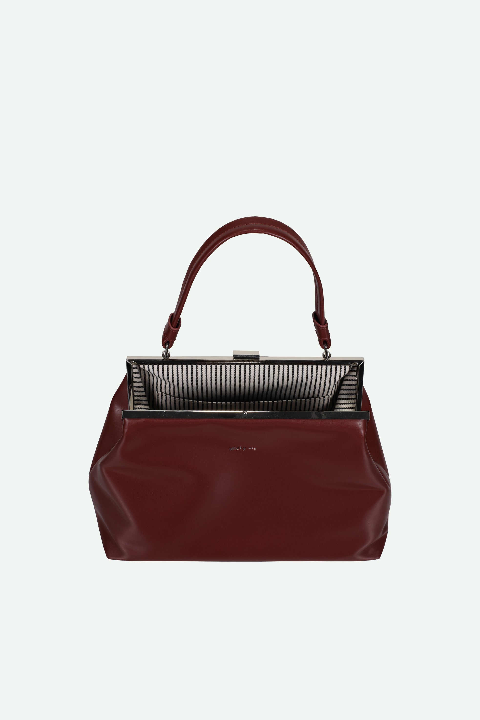 A classic clasp bag. Made from super soft vegan leather, it features silver metal details and an elegant short handle. Chic, effortless and elevated.