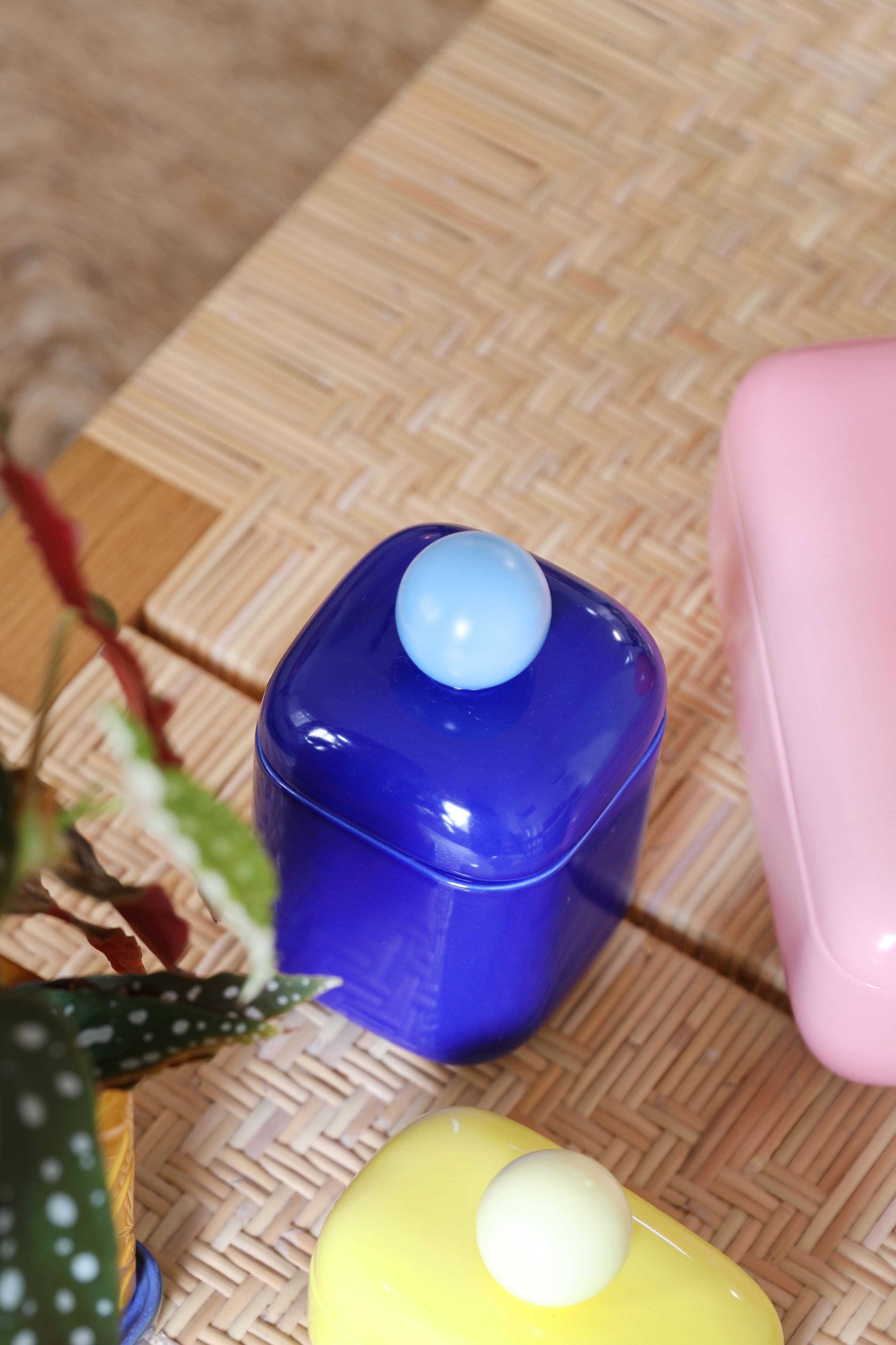 The orb jar’s bright colours and unique shape will put a smile on everyone’s face. The orb jar stores all your items safely inside.